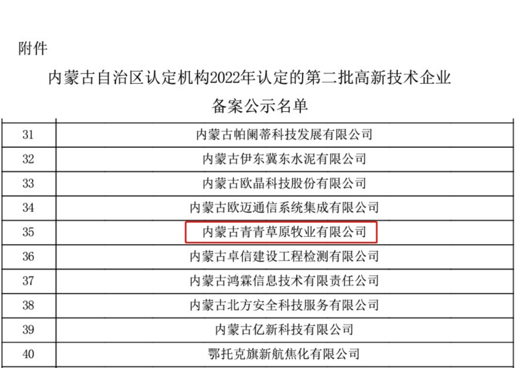 12月1日、12月14日,全國高新技術企業認定管理工作領導小組辦公室分別公布了河南省2022年第一批高新技術企業備案通知和內蒙古自治區2022年第二批高新技術企業備案通知,內蒙古青青草原牧業有限公司及權屬子公司河南中羊牧業有限公司均成功入選。