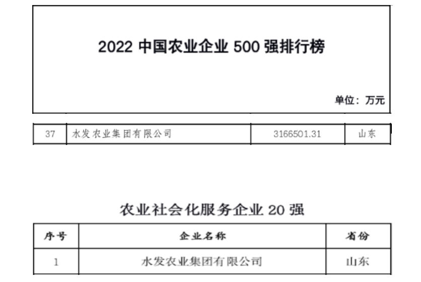 喜訊!水發農業集團榮登2022中國農業企業500強第37位、農業社會化服務企業20強第1位